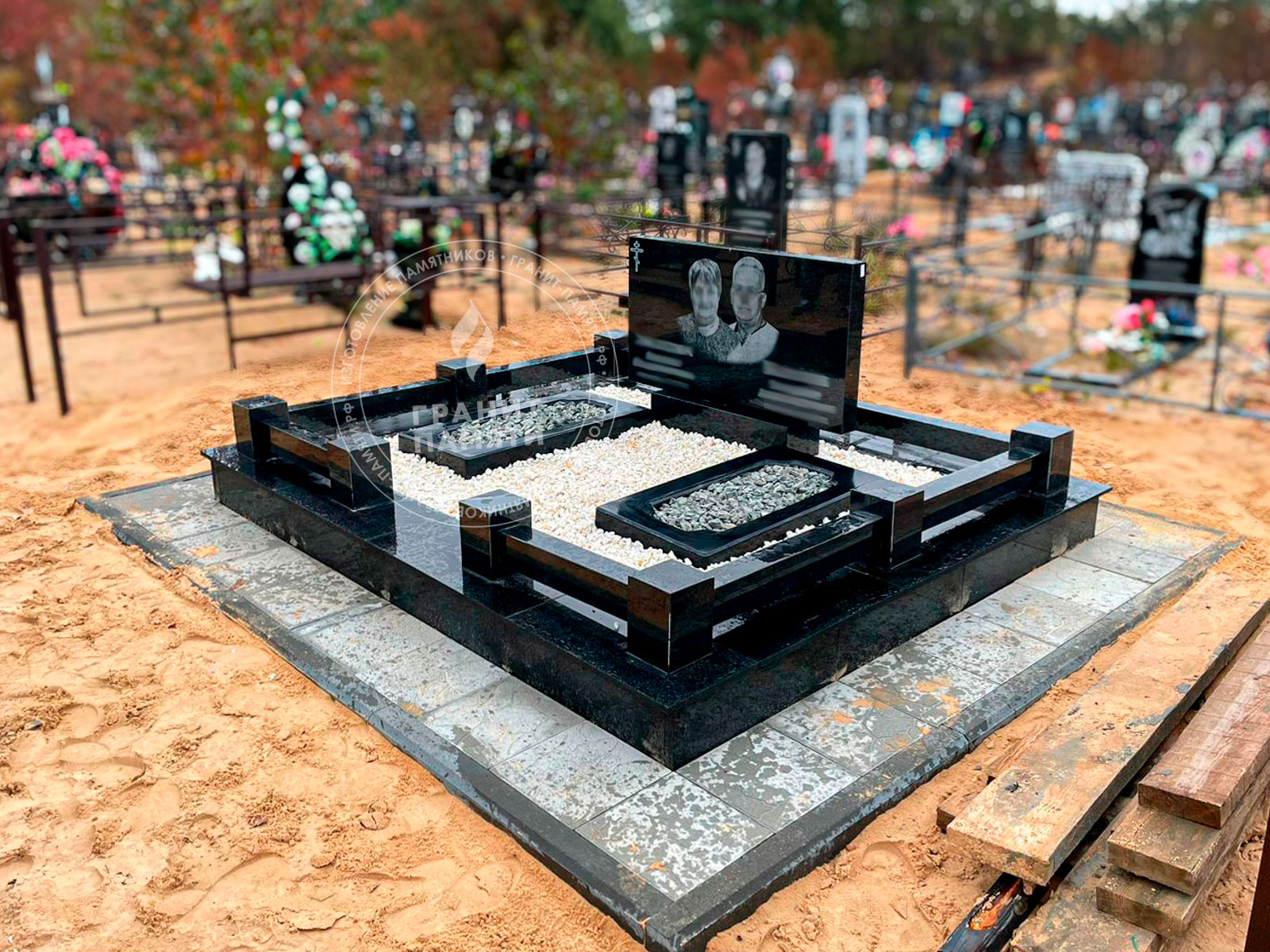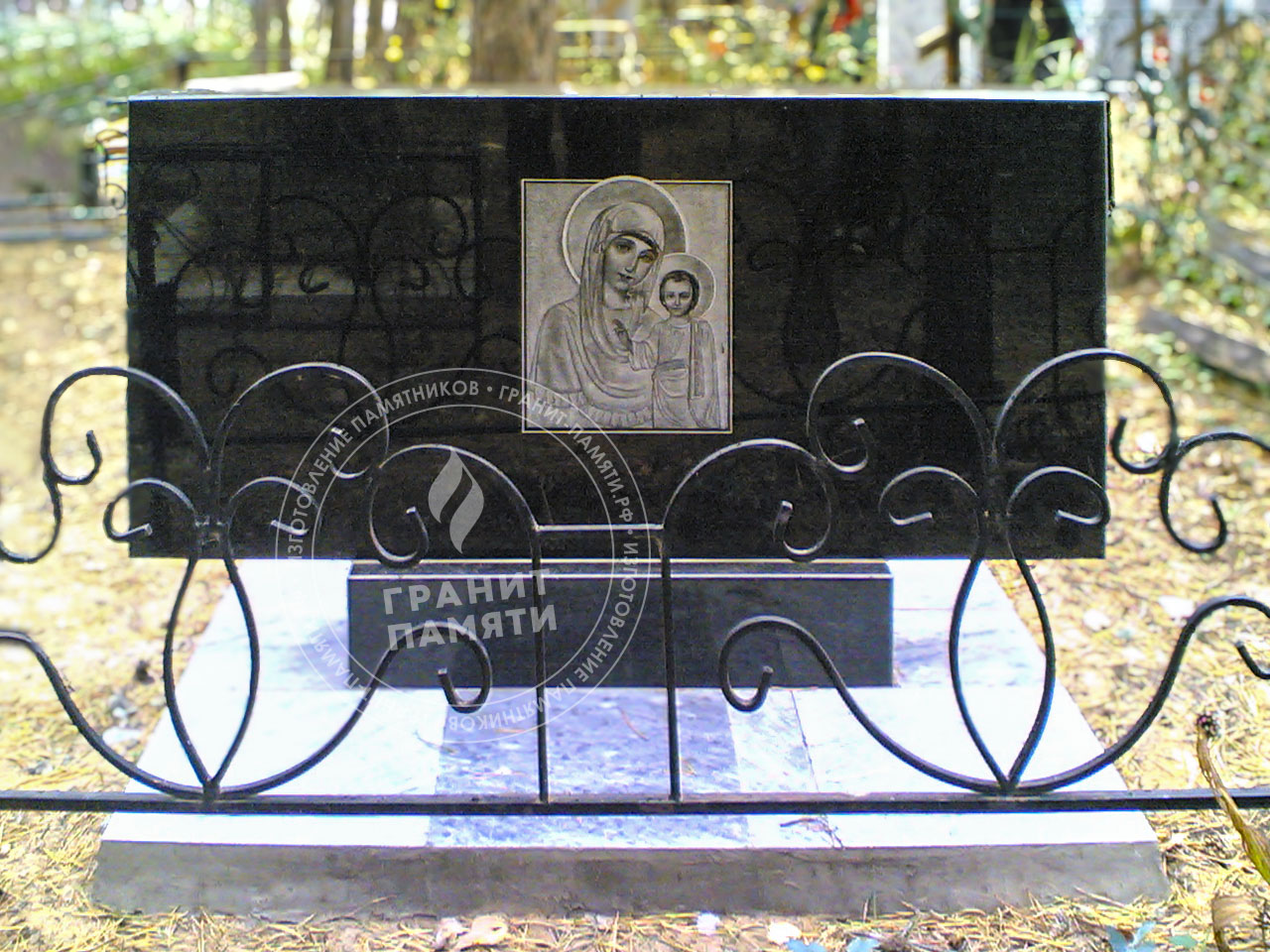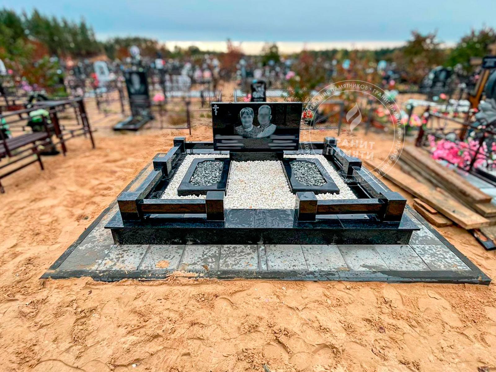 - Доступен в разных комплектациях: с цветниками, с надгробными плитами и т.д.